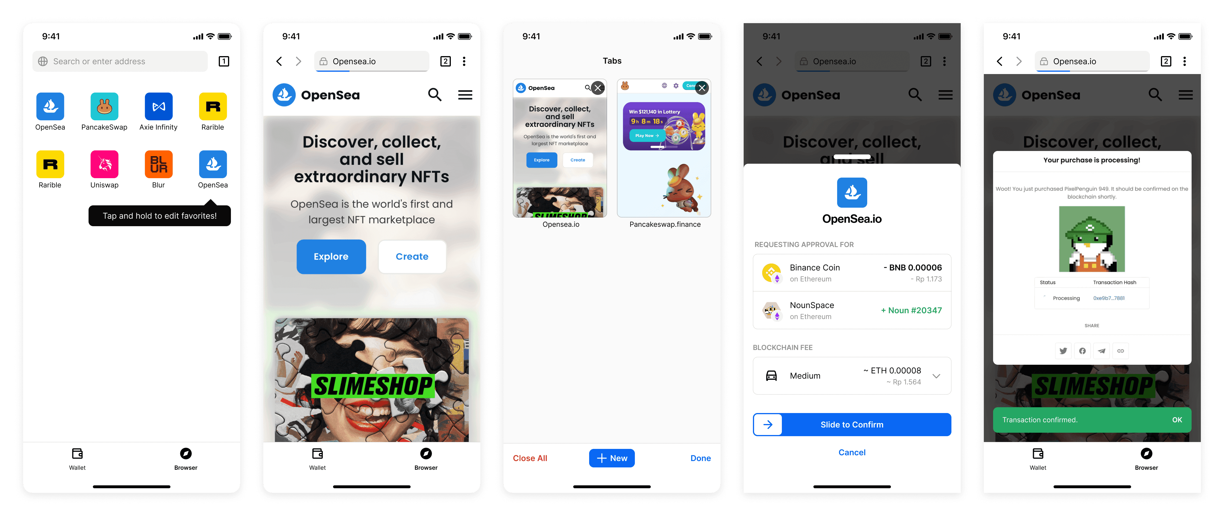 A familiar feeling of built-in browser comes preloaded with curated dApps, so users don't land on a blank page asking “what now?”